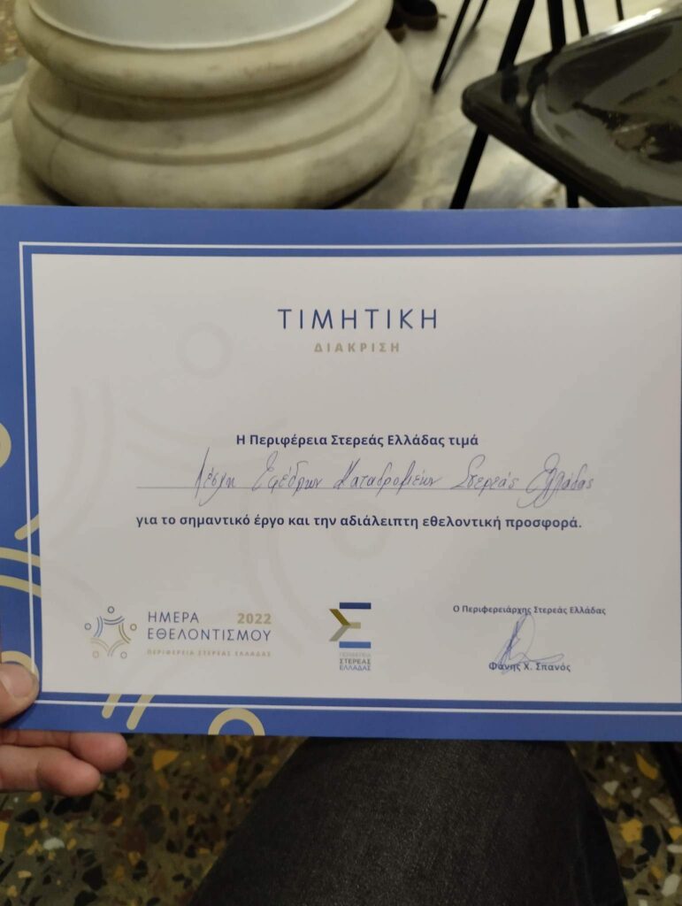 Στις 5 Δεκεμβρίου 2022, στην έδρα της Περιφέρειας Στερεάς Ελλάδας, γιορτάστηκε η παγκόσμια ημέρα εθελοντισμού. Σε μια σεμνή τελετή, βραβεύτηκαν όλα τα εθελοντικά σωματεία της Στερεάς Ελλάδας που είναι ενταγμένα στη Γενική Γραμματεία Πολιτικής Προστασίας, για την αδιάλειπτη προσφορά τους. Στην τελετή παρεβρεθησαν ο αντιπεριφερειάρχης Σανίδας Ηλίας, ο αντιπεριφερειάρχης Αποστολόπουλος Κωνσταντίνος, και ο αντιδήμαρχος Λαμιέων Δημήτριος Τζούφλας, ο Μητροπολίτης Φθιώτιδας Κ.Κ Συμεών, εκπρόσωποι του Δήμου Λαμιέων και ο προϊστάμενος πολιτικής προστασίας κ. Ζώης Πολύζος. Η Λέσχη εφέδρων καταδρομέων στερεάς Ελλάδας, εκπροσωπήθηκε από τα μέλη της, και την τιμητική διάκριση για το σημαντικό έργο και την αδιάλειπτη εθελοντική προσφορά, παρέλαβε ο πρόεδρος της λέσχης, κ. Αγγέλης Ιωάννης.
